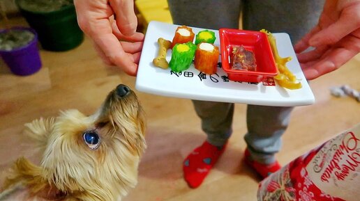 Купили суши для Дези! Новогодний стол из лакомств для йорка! Поздравляем с Новым Годом!
