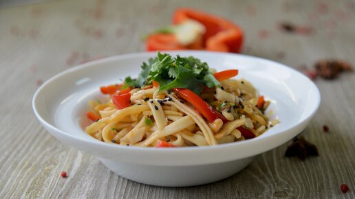 Готовлю азиатское блюдо "удон с овощами" на русский лад. Добавляем копчёный сыр к классическому рецепту. Пальчики оближешь.