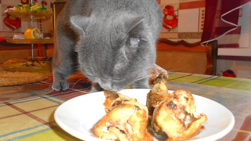 Кошка ворует жареную рыбу со стола