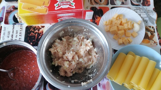 Каннеллони с куриным фаршем, запеченные в томатном соусе.