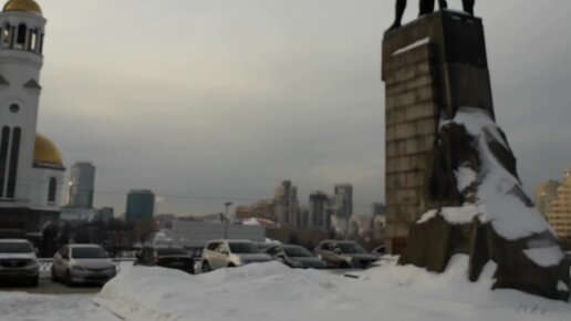 Скульптура "Комсомолу Урала" смотрит от Вознесенского храма на Храм-памятник на Крови