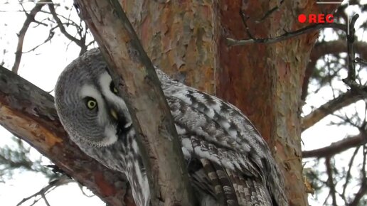 Встреча в лесу с Совой/ Бородатая неясыть смотрит на камеру.