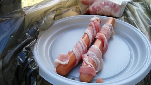 Обед по-быстрому на участке. Готовим сосиски в беконе на мангале. Доширак с креветками ;)