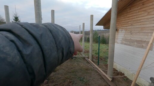 Бурим дырки для столбов под лазерный уровень. У фундамента перепад от 60см до 180 см. 4 день стройки.