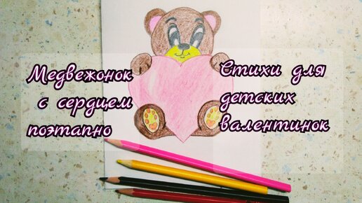 Учимся рисовать мишку с сердечком| Со стихами для детских валентинок