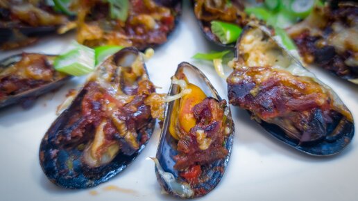 Мидии, запечённые с сыром, в пряном соусе.