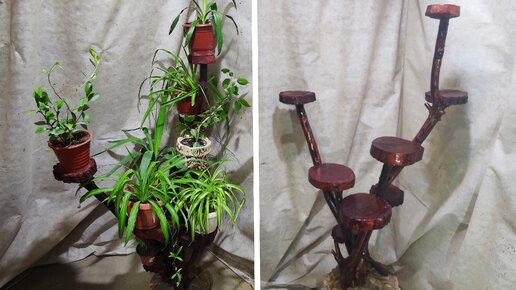 Из Сухих веток и спилов дерева сделал полку для цветов