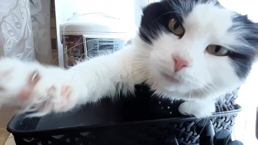Кот на кухне в малюсенькой корзиночке для фруктов. И как он туда помещается?