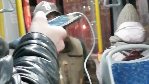 Бедолага поет в автобусе, играя рукой как будто на гитаре.