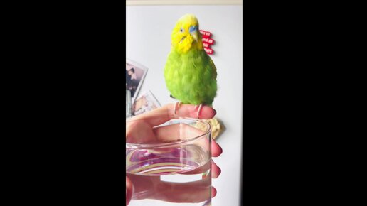 Как попугайчик пьет из стакана.