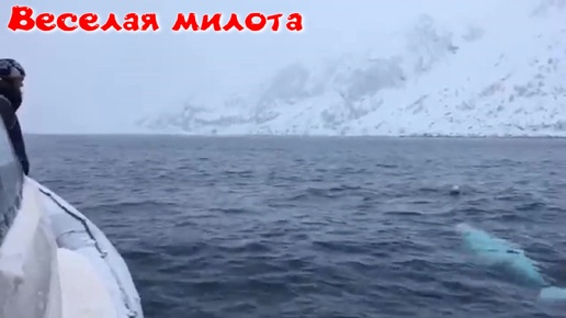 Большой белый дельфин играет в мяч с человеком в открытом море