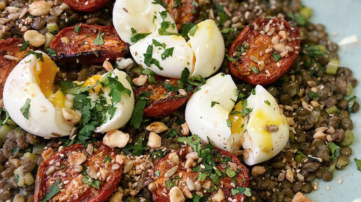 Чечевица с помидорами, яйцами и приправой дукка