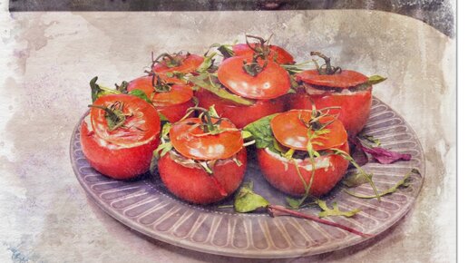 Запечённые помидоры с салатом из печени трески. Друг, повар, или другие советники, не подсказывали.