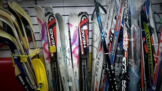 Показываю обычные и горные лыжи, а также их комплектующие...