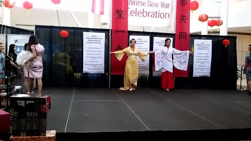 Выступление китайских девушек на праздновании Восточного Нового Года в обычном торговом центре в США.