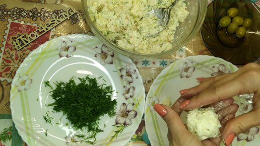 Закуска: рафаэлло из крабовых палочек (укропные и сырные)