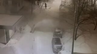 Утренний снежный душ в 6 утра приняли машины во дворе по улице Крылатские Холмы 27/2.