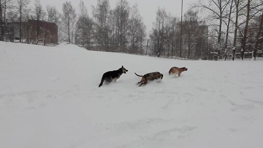 На улице зимой играют 3 собаки. Очень весело носятся