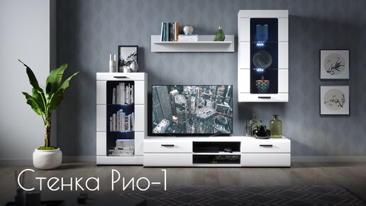 Обзор стенки РИО с белыми глянцевыми фасадами и подсветкой