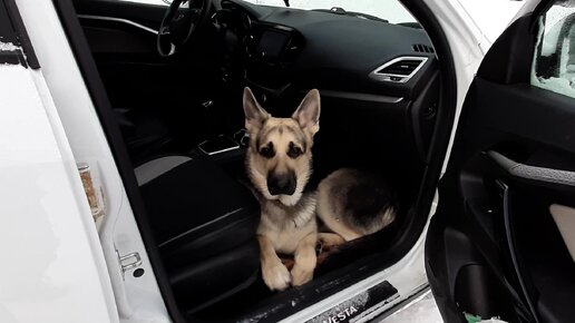 Как щенок овчарки садится в машину. Обустроился на месте, будто в гнездышке
