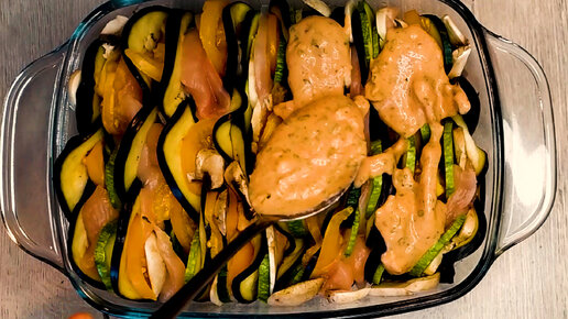 Нарезаю овощи кружками и запекаю: готовлю сытный "Рататуй" с куриными слайсами (на второй день еще вкуснее)
