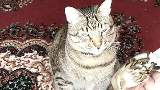 Воробей клюёт кота, а кот дает ему лапой под зад