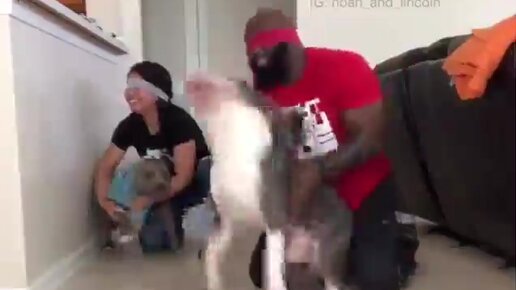 Кто быстрее оденет свою собаку с завязанными глазами.