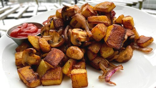 Жареная картошка с грибами. Готовлю картофель интересным методом, ничего не пристает ко дну сковороды.