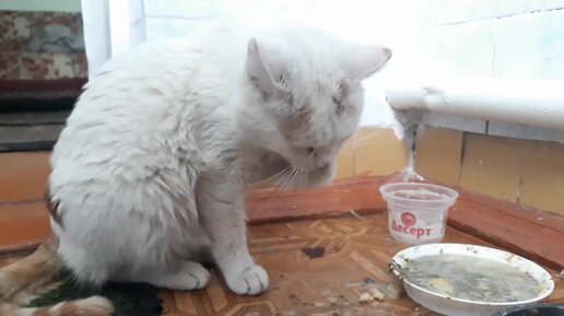 Белый кот кушает суп не так, как обычные коты. После его трапезы приходится за ним убирать