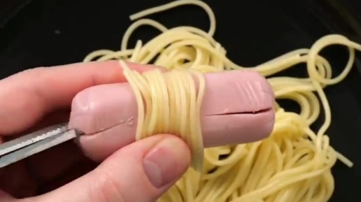 Очень необычный завтрак с сосисками и лапшой. За 5 минут.