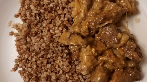 Говяжья печень в сметане с луком.