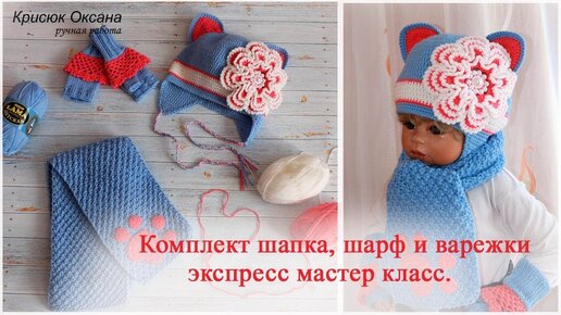 Вязание крючком. Детский комплект крючком шапка, шарф и митенки, экспресс МК