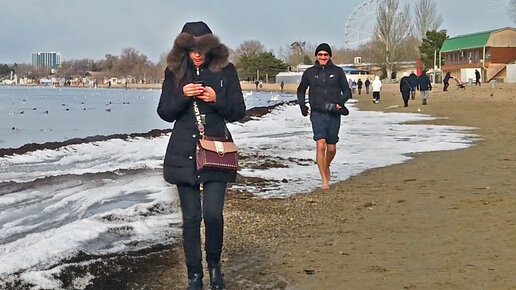 Анапа. Пляж, снег и лёд. Черное море у берега замерзло