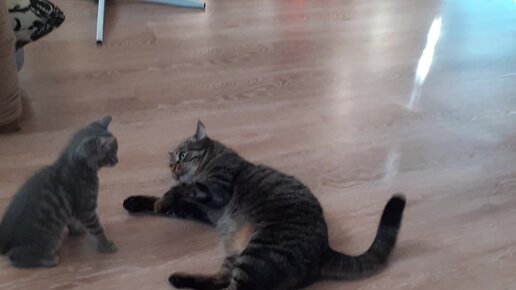 Котенок Гучи нападает на Взрослого Мощного Кота! Очень забавно!:)))