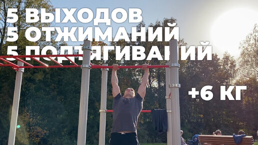 Сет на турнике: 5 выходов - 5 отжиманий от перекладины - 5 подтягиваний (+6кг) за 23 секунды