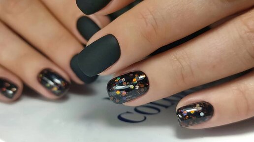 Маникюр / Черные матовые ногти / Дизайн глиттерами