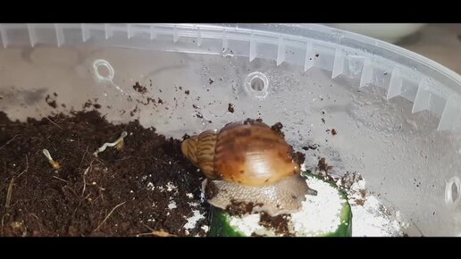 Любуемся на юную улитку ахатину, которая должна вырасти с ладонь размером. Ждем, когда высунет рожки и начнет есть огурец