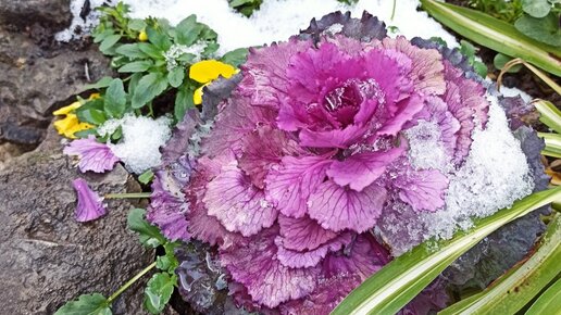 Пальмы и цветы в снегу на улицах Сочи