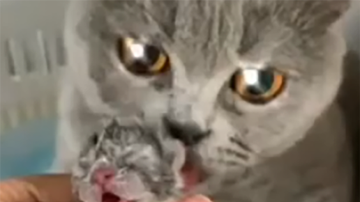 Как мама кошка умывает своего котёнка