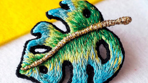 Листок Монстера - вышивка брошки гладью