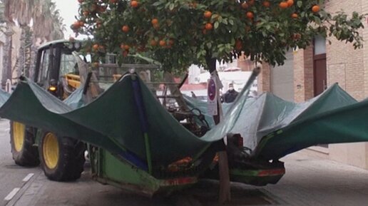 Как чудо-машина стряхивает апельсины в испанской Валенсии