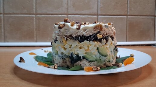 Первый в истории кухни КОПЧЁНЫЙ САЛАТ. Аристократический салат с курицей, черносливом и курагой.