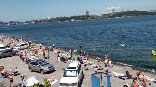Пляж острова Русский во Владивостоке - люди купаются под самым длинным мостом в России