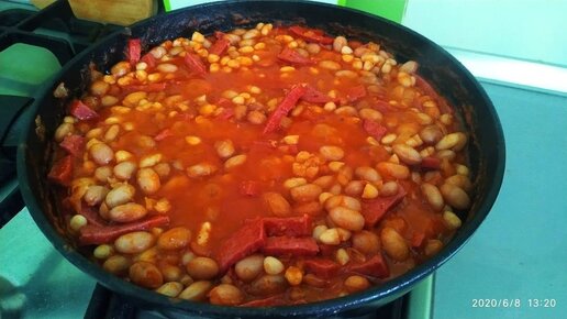 Фасоль в томатном соусе с колбасой.Готовлю фасоль по быстрому.