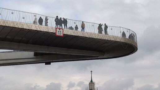 Прогулка по парящему мосту в парке Зарядье в Москве. Виды на Москву-реку с моста