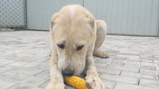 Среднеазиатская овчарка ест кукурузу