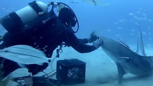 Аквалангист гладит акулу, она ластиться к нему как кошка