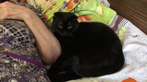 Кот Вася черный прижался щечкой к своей хозяйке