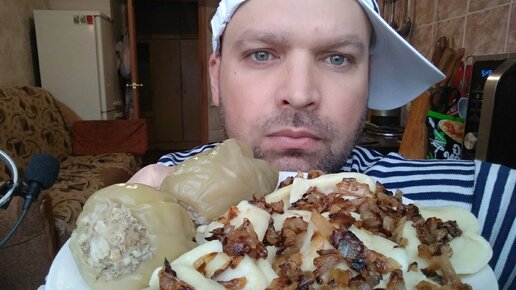 Кушаю фаршированный перец и вареники.