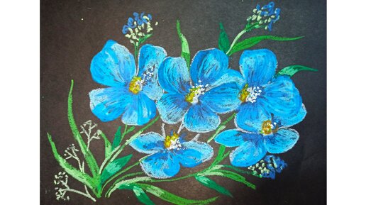 Синие цветы на черной бумаге - рисунок масляной пастелью.